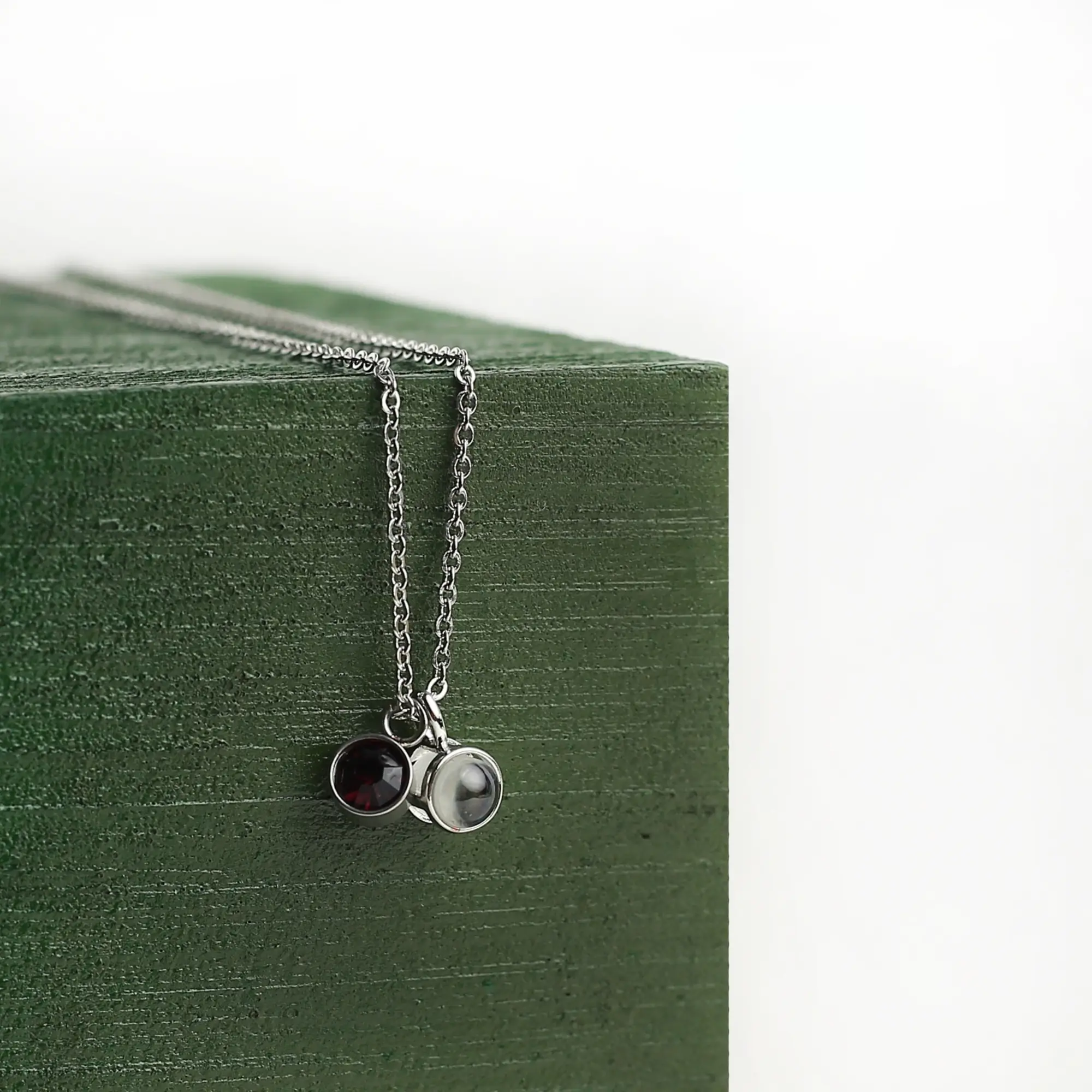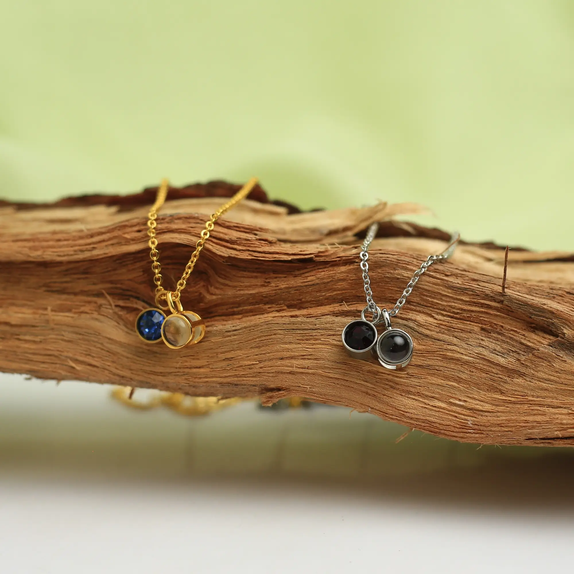 A delicate harmony of light and love — this birthstone memory necklace holds your story close. One charm glows with your chosen birthstone, while the other hides your cherished photo inside, revealed through light or camera. Together, they celebrate connection, individuality, and the moments that define you.