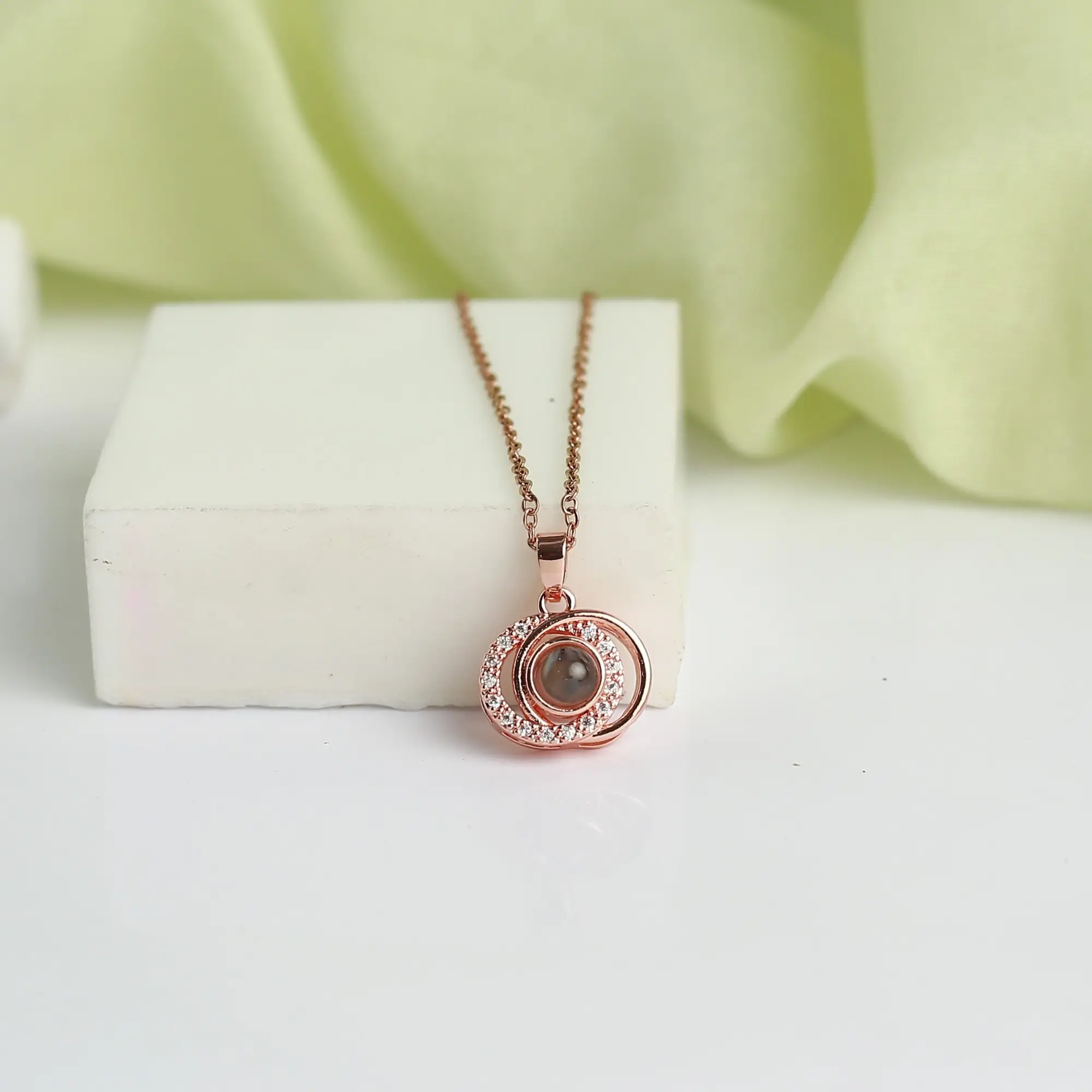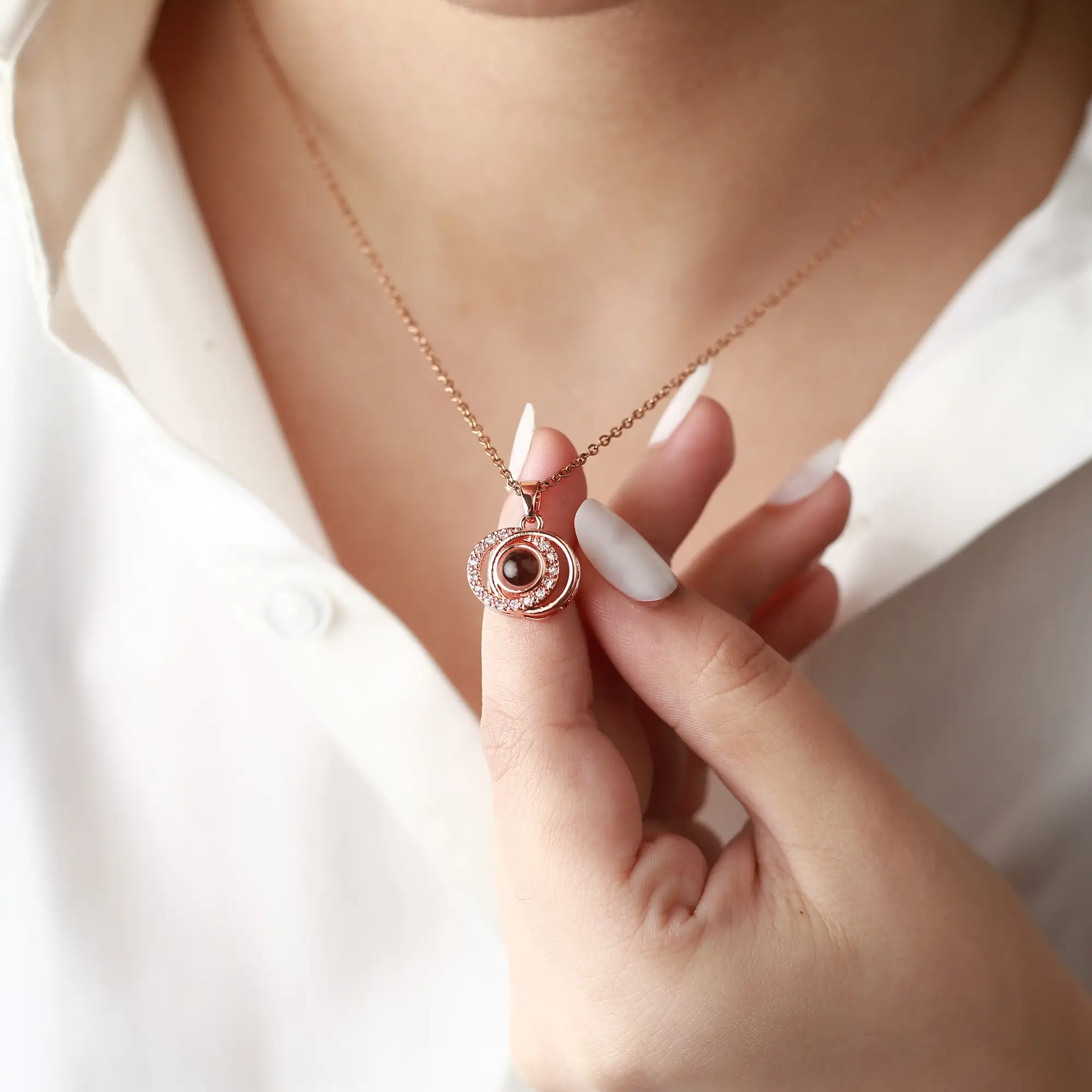 Radiant and full of meaning, this double halo necklace captures the beauty of love and memory in one shining design. Sparkling CZ stones surround the pendant like a circle of light, while inside, your hidden photo is revealed through projection — a precious moment brought to life with every glance.