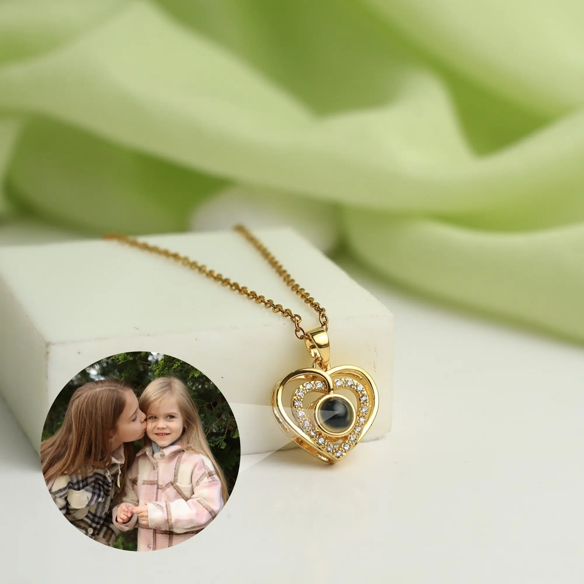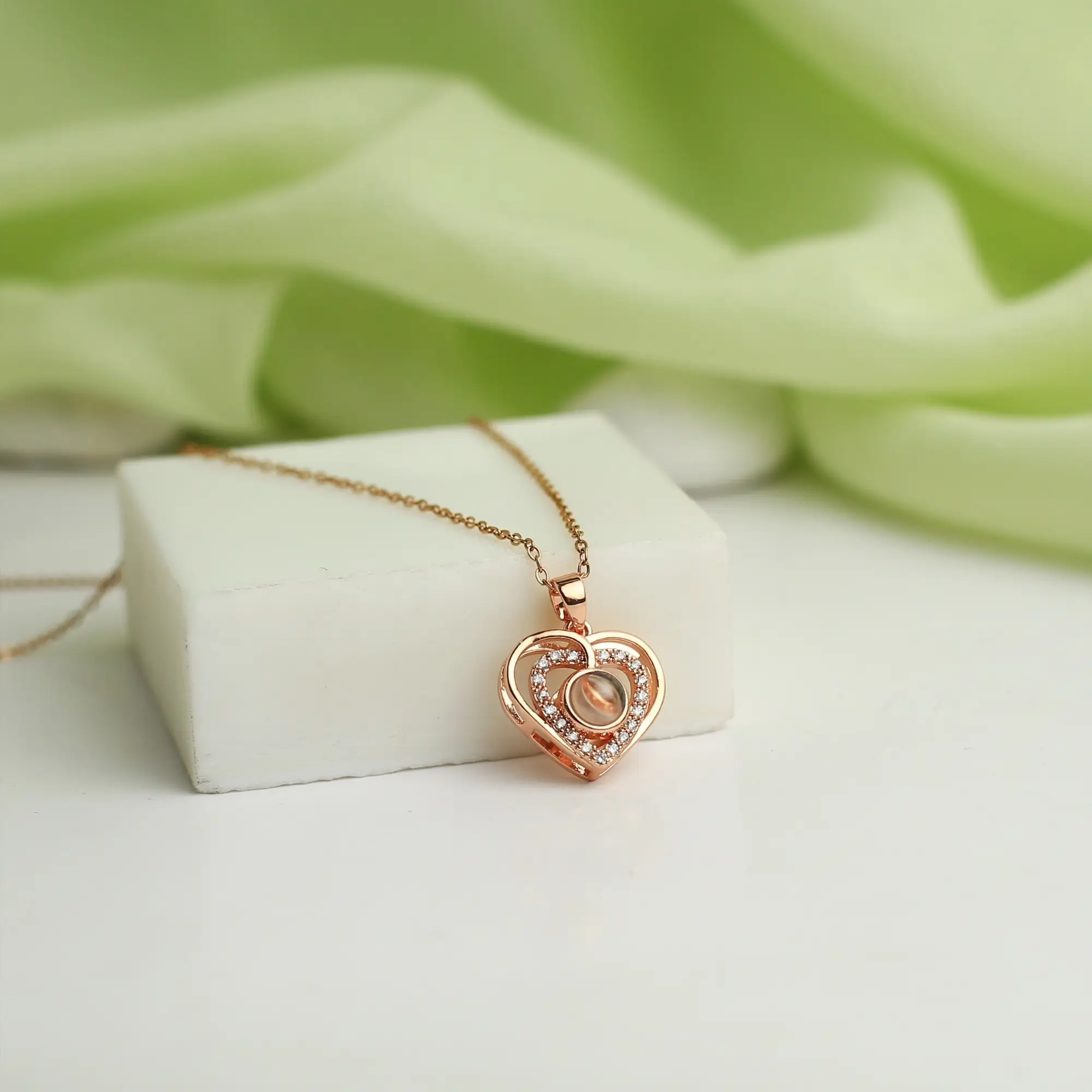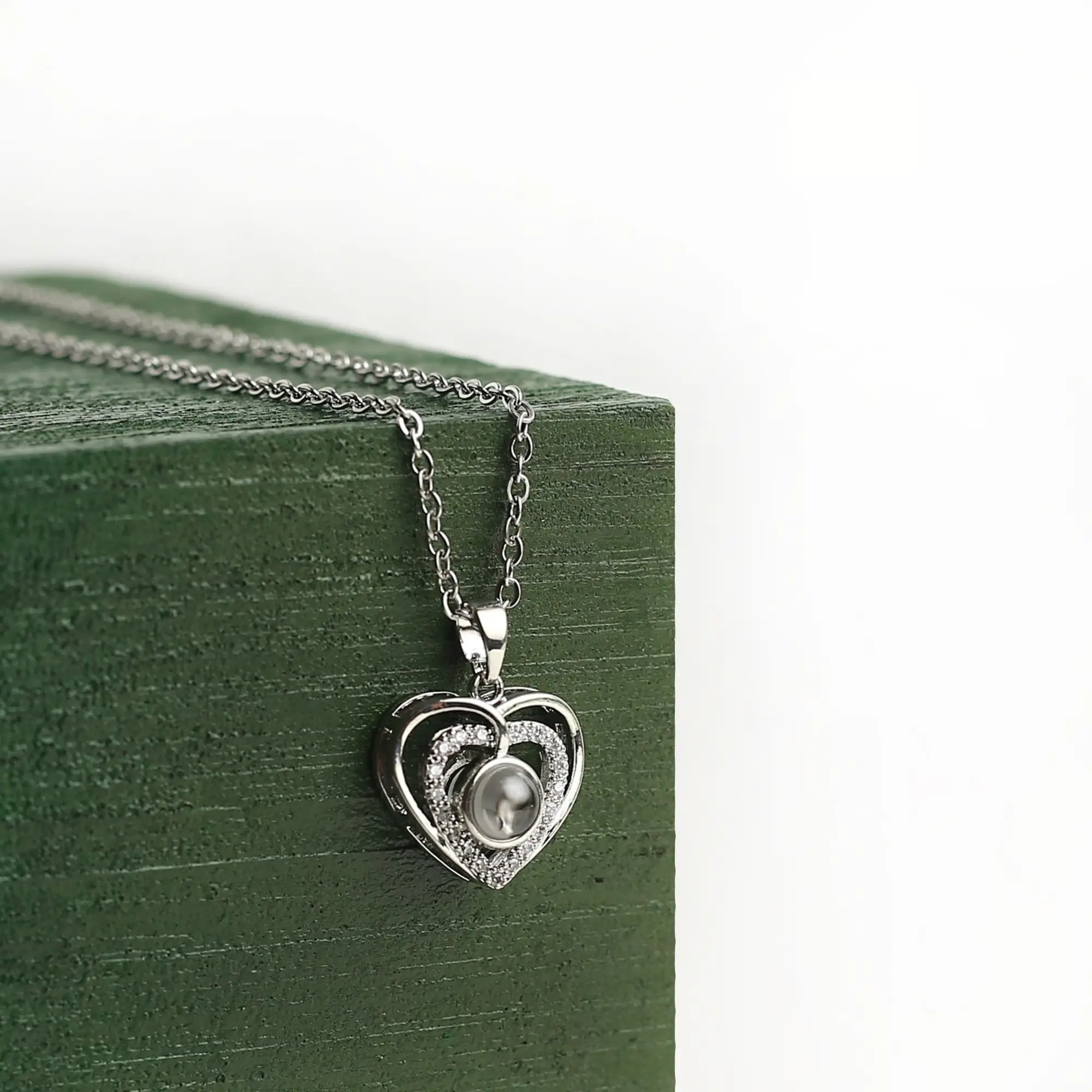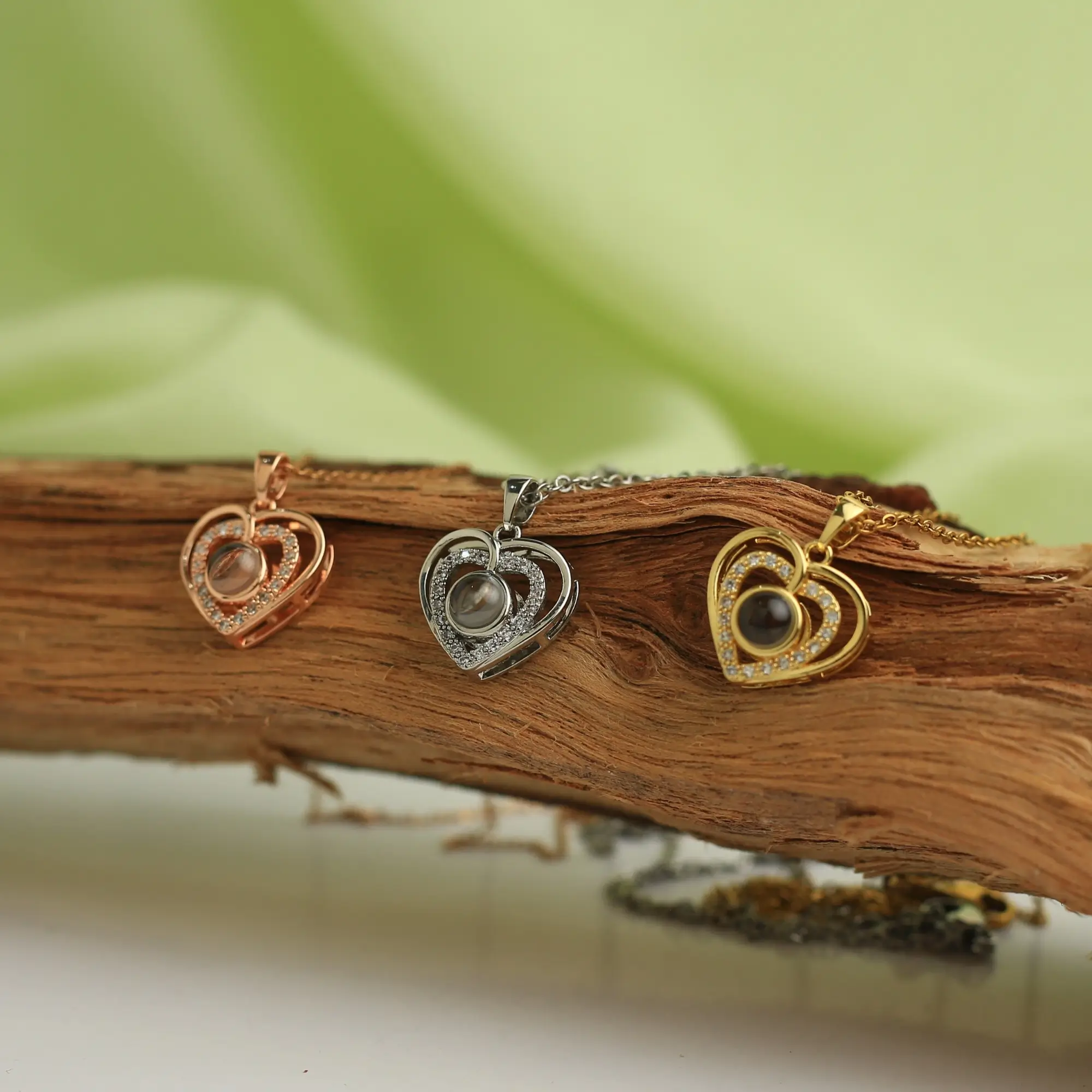 Bound by love and illuminated by light — this double heart projection necklace, adorned with sparkling CZ stones, holds more than beauty; it carries a story only you can see. Look into the center stone, and your chosen photo appears — a secret moment that shines as bright as your bond.