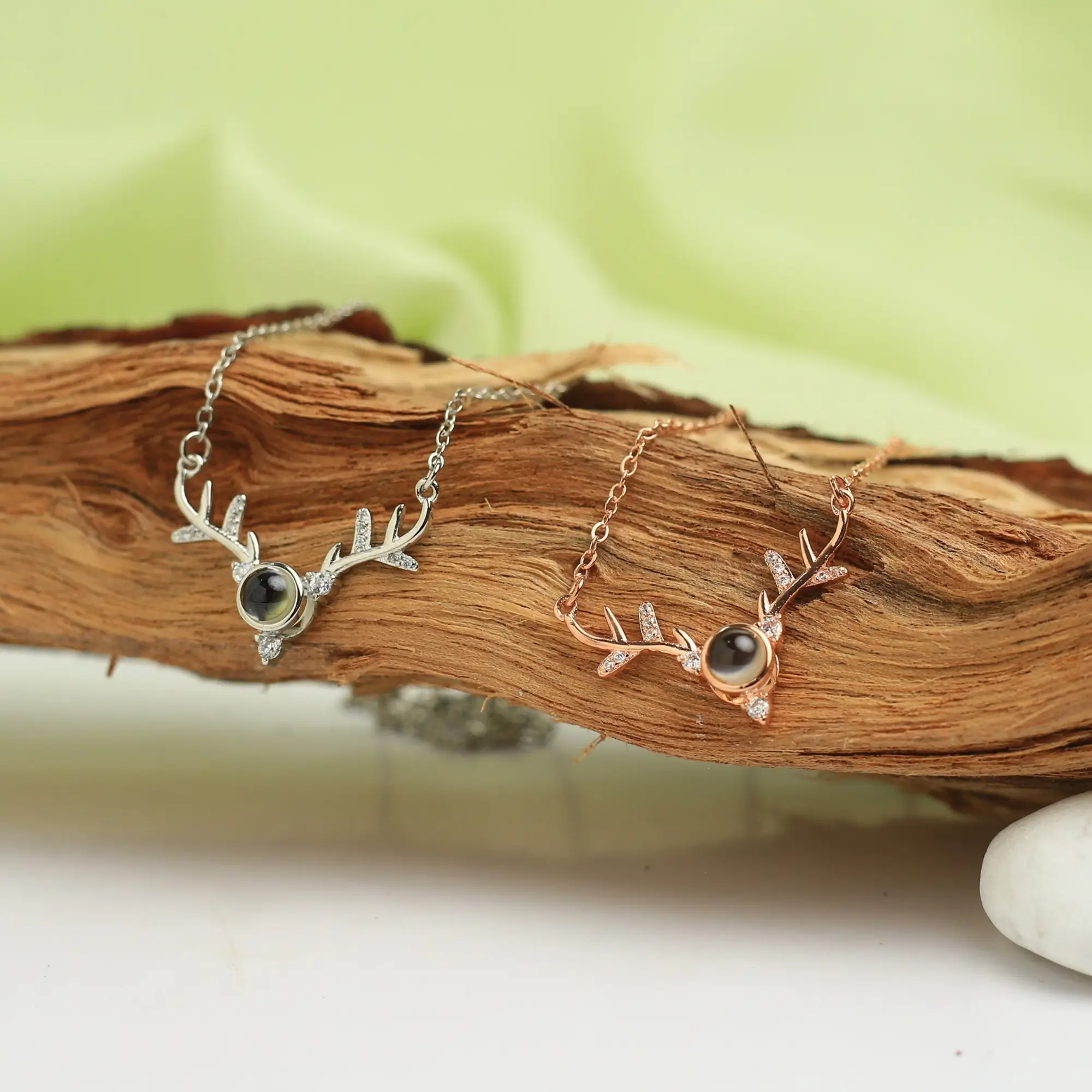 Graceful and symbolic, this forest spirit projection necklace captures the quiet strength of nature and the warmth of connection. Designed with delicate antlers embracing a hidden photo projection, it reveals your chosen image through light — a secret memory glowing softly, like sunlight through the trees.