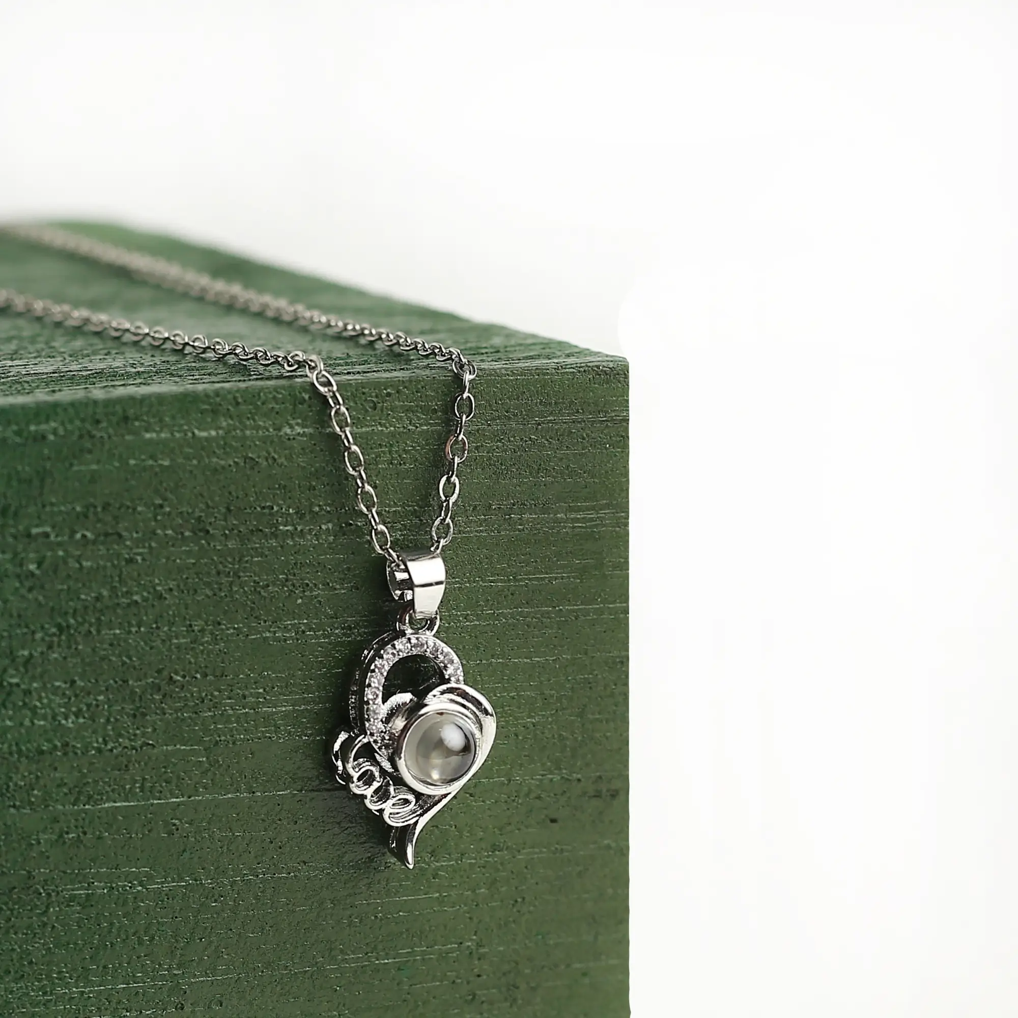 Graceful and deeply symbolic, this forever love projection necklace captures the beauty of a bond that never fades. Look into the pendant’s center and discover a hidden photo — your most cherished memory brought to life through light. Its gentle sparkle and flowing “love” design remind us that the truest connections don’t end; they grow stronger with time.