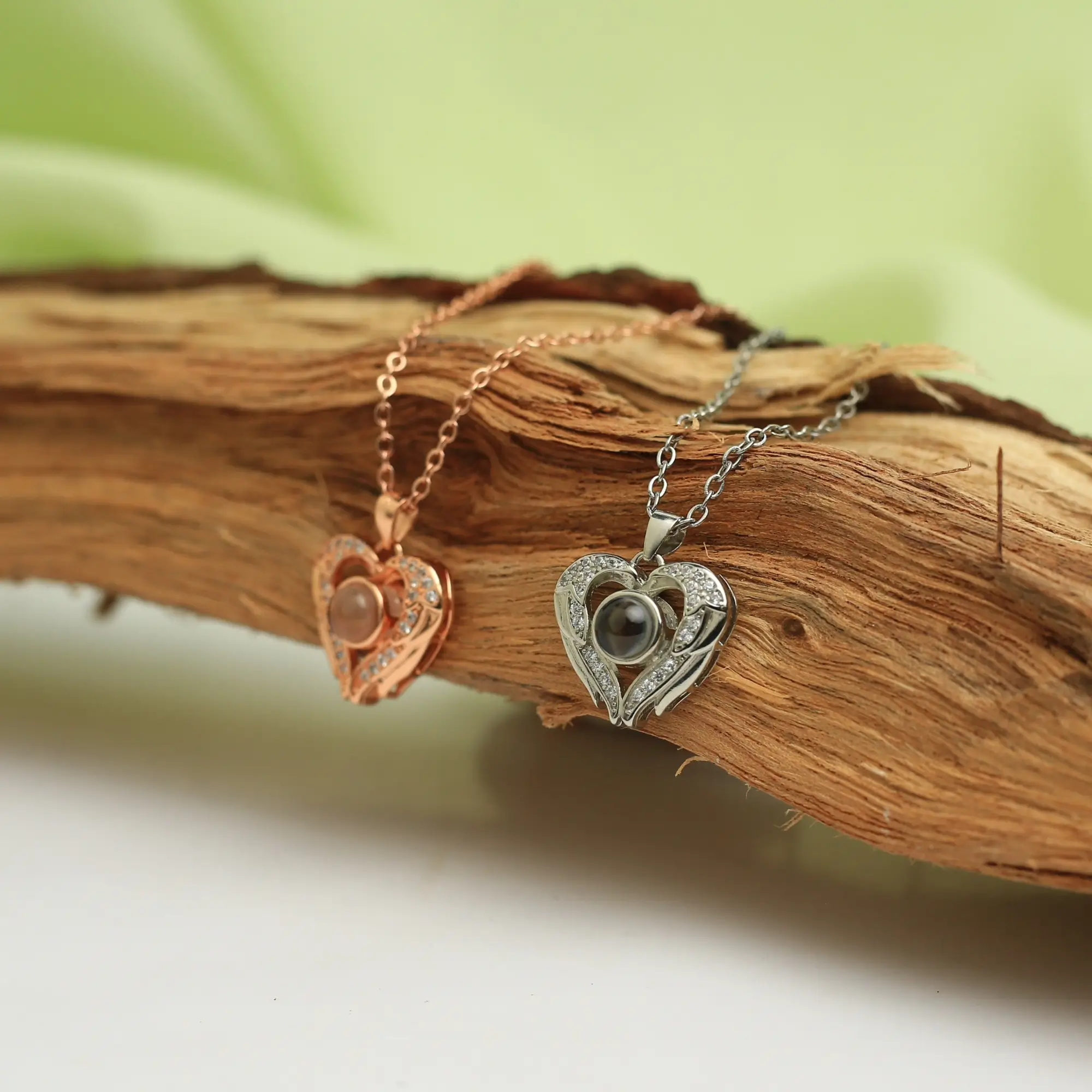 Delicate yet powerful, this pendant carries the spirit of protection and love. Its guardian wings embrace a hidden photo inside the heart — a secret memory meant only for you. Each curve glimmers softly, like the quiet comfort of someone watching over from afar.