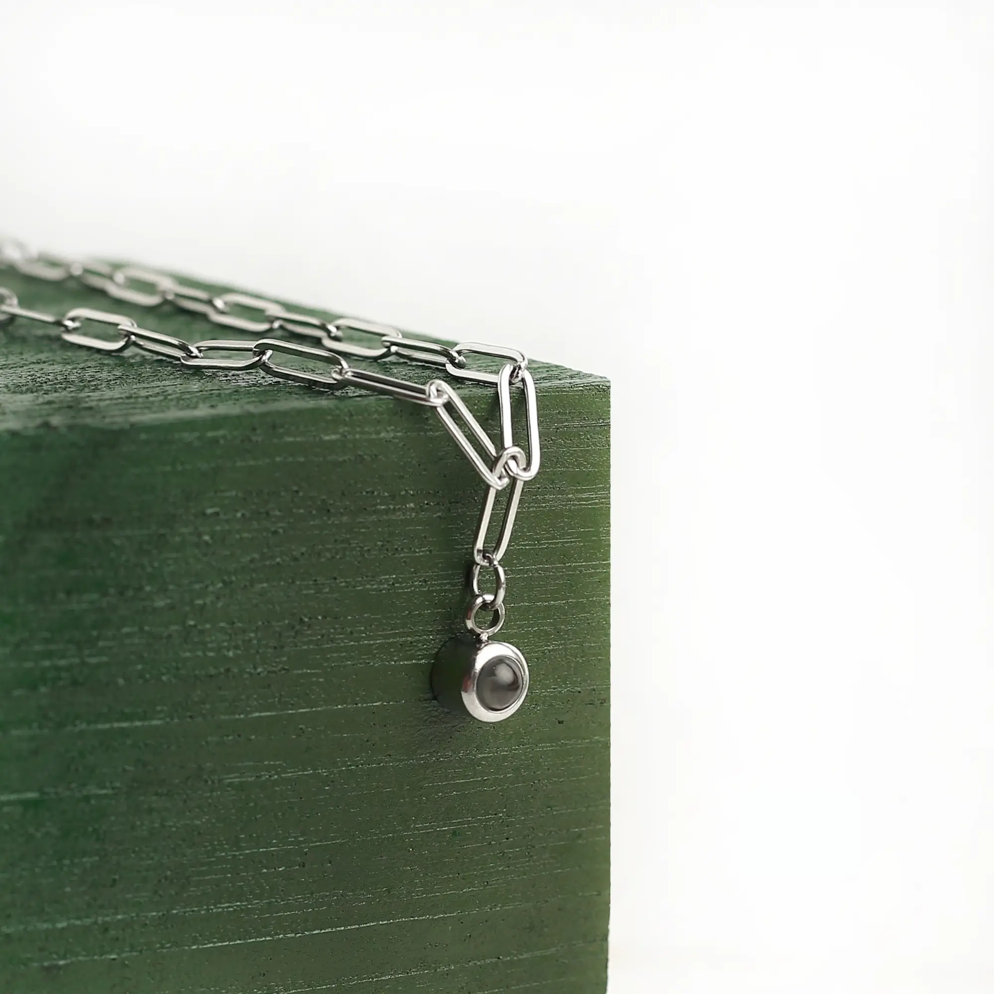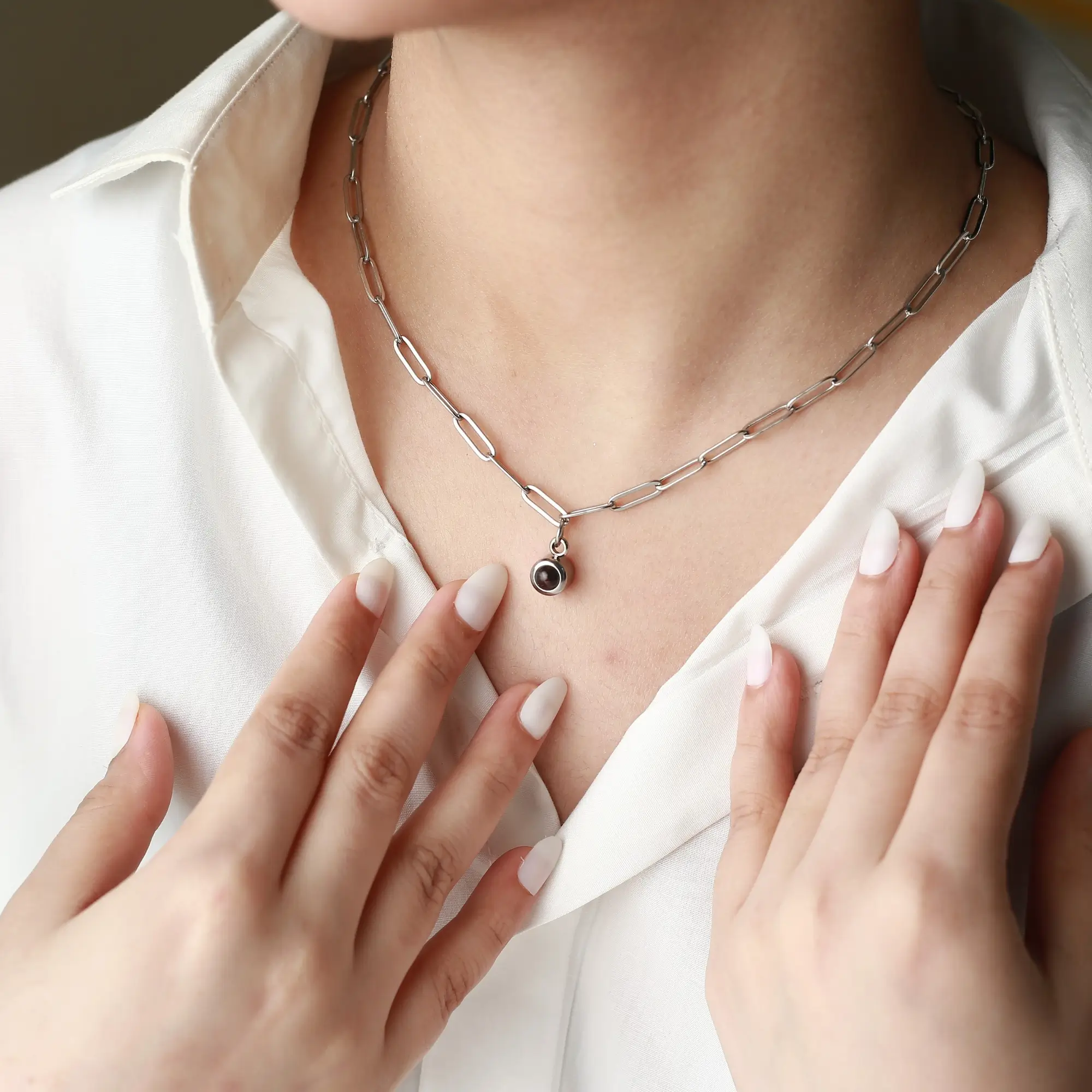 Modern and minimal, yet deeply personal — this paperclip necklace hides a secret within its shine. Look closely through the pendant, and your chosen photo appears, projected in light — a moment captured, a memory only you can see.